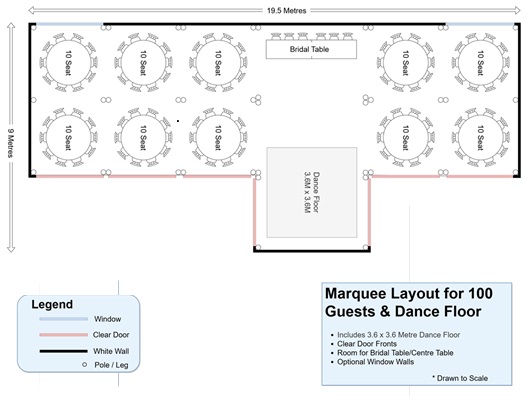 Marquee for 100 guests & dance floor , clear rollup front walls, back corner window walls & Layout Plan to scale