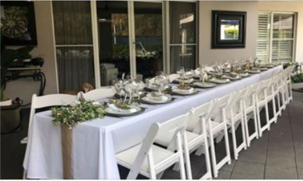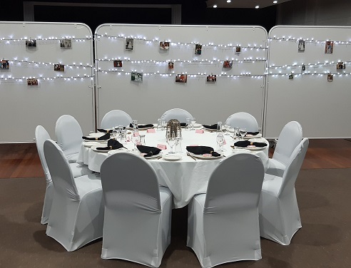 - $3500 - 19.5m * 6m walls, sit 100 people, 6 bridal party includes tables, chairs, skirts, tablecloths (picture below).
